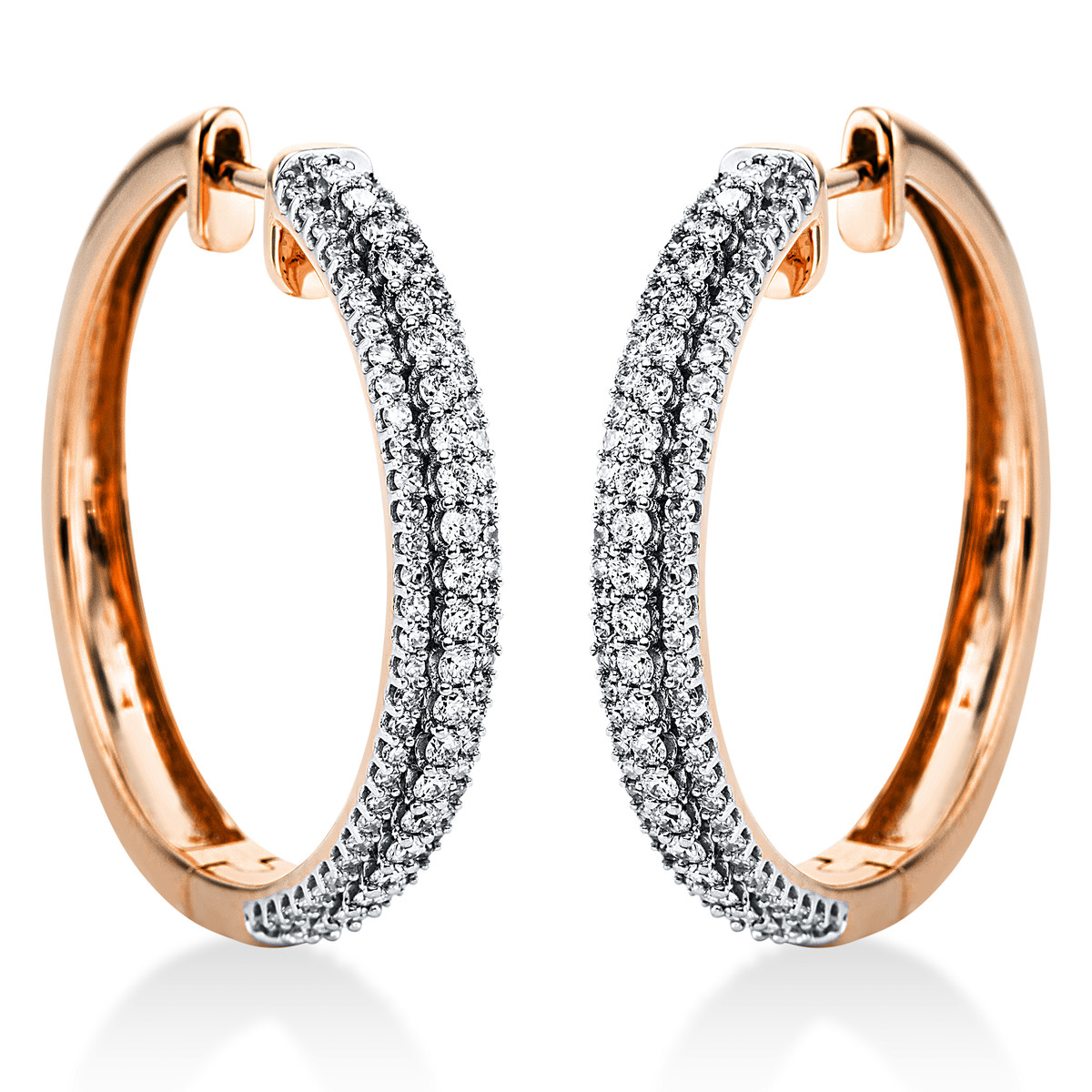 Creolen 18 kt RG, Fassung rhodiniert, 174 Brillanten 0,97 ct, TW-si, H:27,8 mm, B:28,5 mm, S:3,8 mm