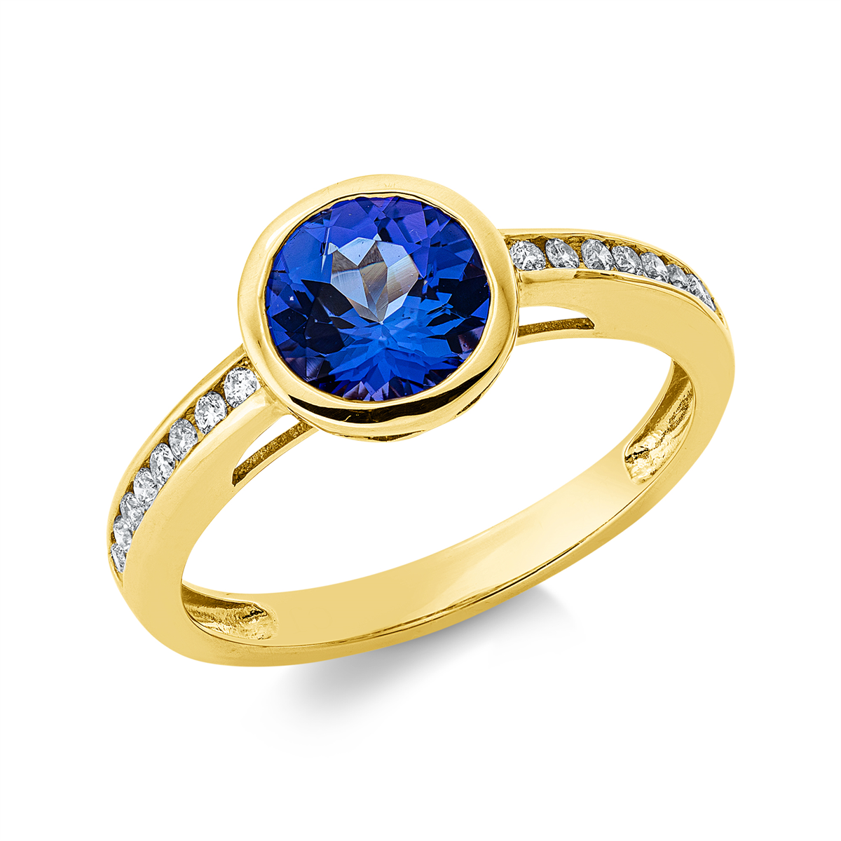 Ring 14 kt GG, 16 Brillanten 0,15 ct, TW-si, 1 Tansanit 1,56 ct blau, B:8,3 mm, Weite:54