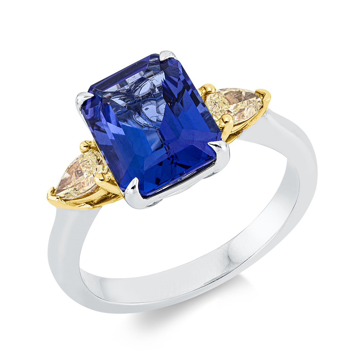 Ring 14 kt WG+GG, 2 Tropfen 0,45 ct, gelb, 1 Tansanit 3,12 ct blau, Weite:55