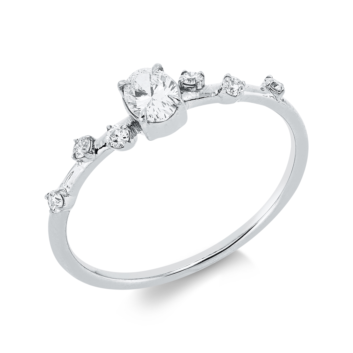 Ring 18 kt GG, 2 Brillanten 0,03 ct, TW-si, 1 Oval 0,25 ct, TW-si, 4 Brillanten 0,05 ct, TW-si, H:3,5 mm, B:4,5 mm, Weite:54