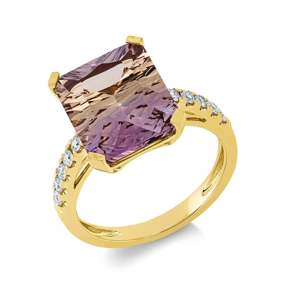 Ring 18 kt GG, 10 Brillanten 0,25 ct, TW-si, 1 Ametrin 5,85 ct multicolor, Weite:53