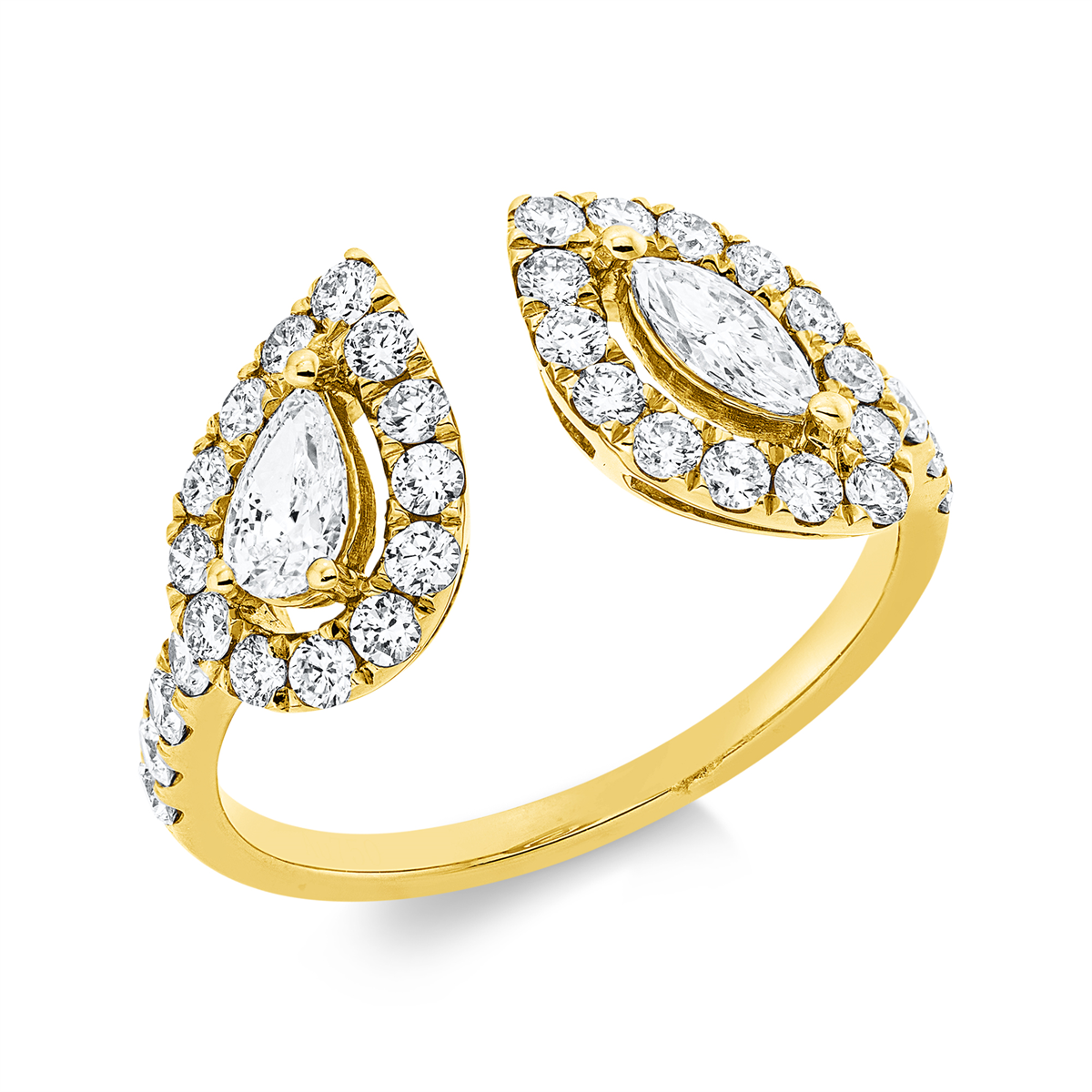 Ring 18 kt GG, 1 Navette 0,15 ct, TW-vsi, 1 Tropfen 0,19 ct, TW-vsi, 35 Brillanten 0,72 ct, TW-si, H:17,0 mm, B:10,0 mm, Weite:53