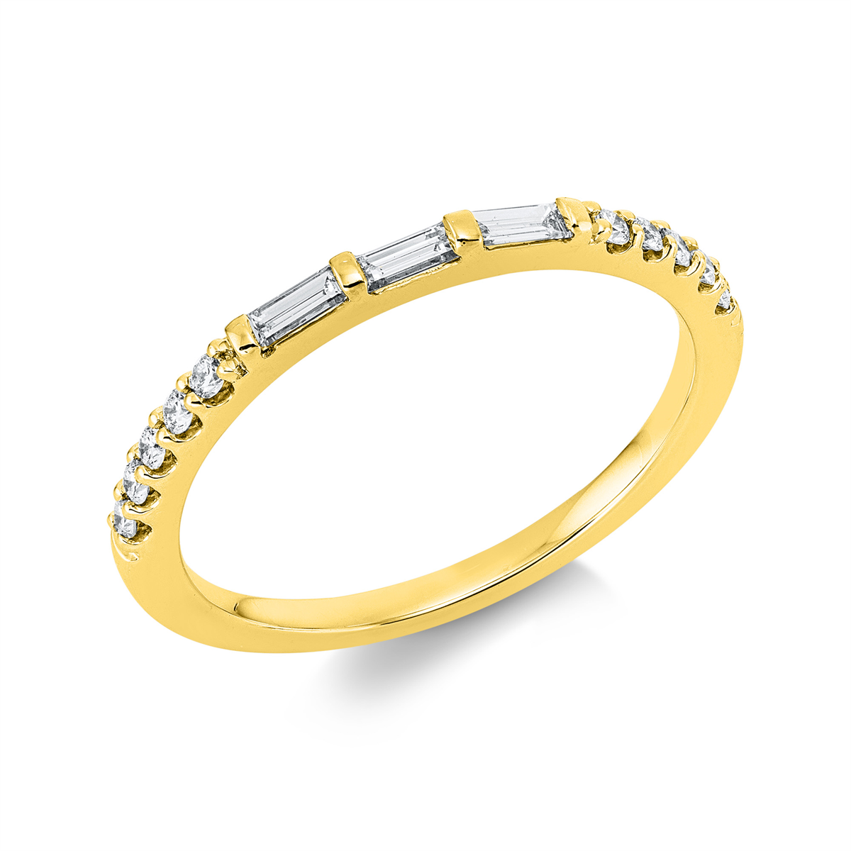 Ring 18 kt GG, 2 Baguette 0,07 ct, TW-si, 1 Bag. 0,04 ct, TW-si, 10 Brillanten 0,11 ct, TW-si, B:1,4 mm, Weite:54