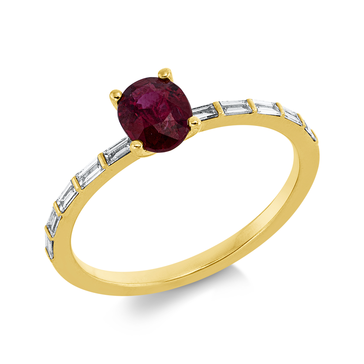 Ring 18 kt GG, 10 Baguette 0,17 ct, TW-si, 1 Rubin 0,62 ct rot, Weite:53