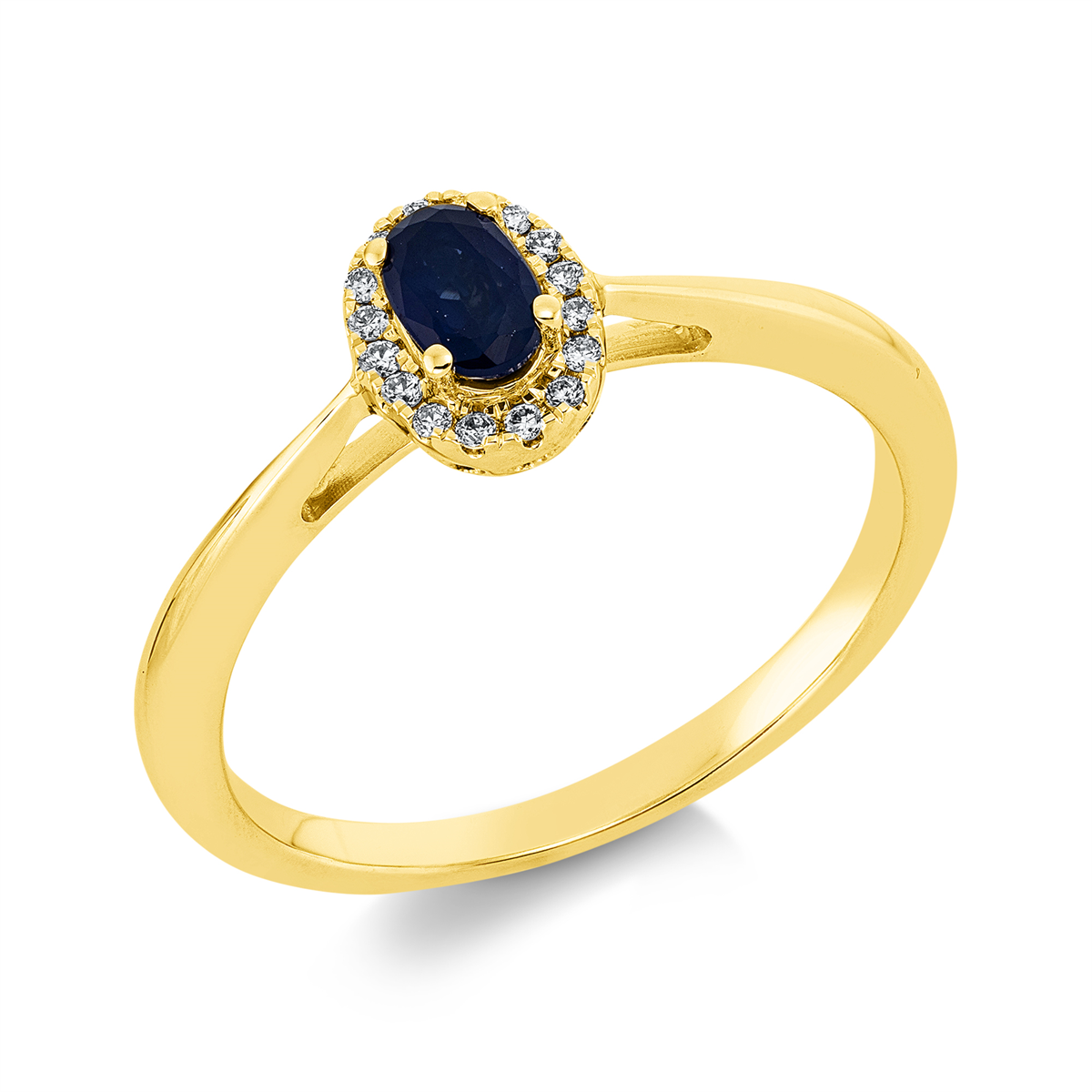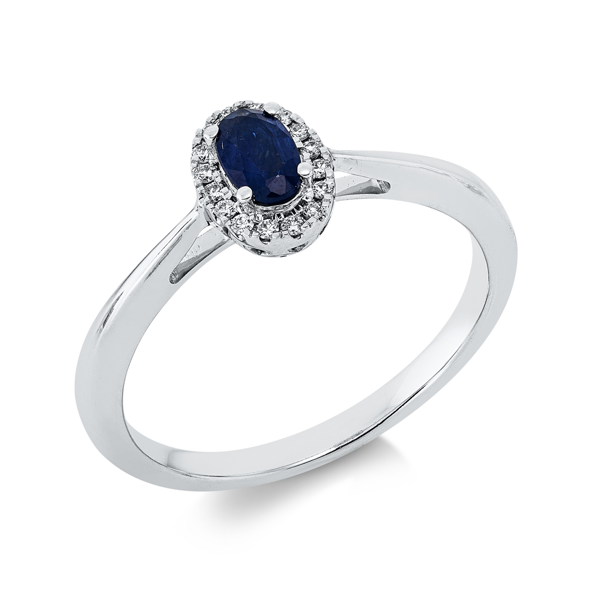 Ring 18 kt GG, 16 Brillanten 0,07 ct, TW-si, 1 Saphir 0,28 ct blau, H:5,8 mm, B:7,6 mm, Weite:54
