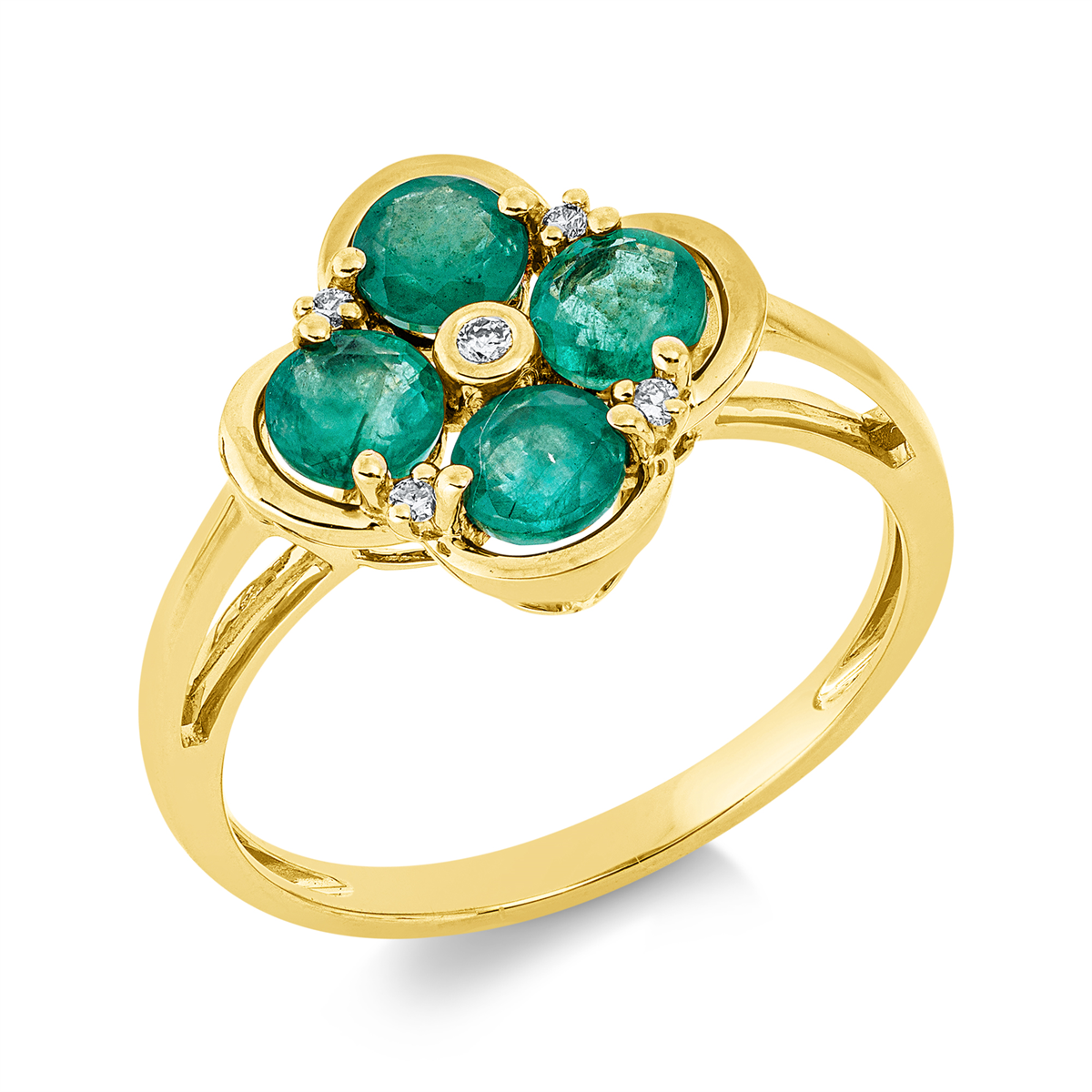 Ring 18 kt GG, 5 Brillanten 0,05 ct, TW-si, 4 Smaragde 1,21 ct grün, H:12,5 mm, B:12,1 mm, Weite:53