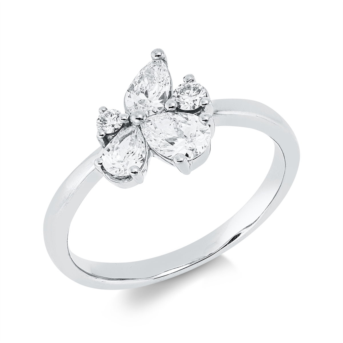 Ring 18 kt GG, 1 Brill. 0,06 ct, TW-si, 1 Tropfen 0,15 ct, TW-si, 1 Tropfen 0,20 ct, TW-si, 1 Tropfen 0,25 ct, TW-si, 1 Brill. 0,03 ct, TW-si, H:9,4 mm, B:9,5 mm, Weite:54