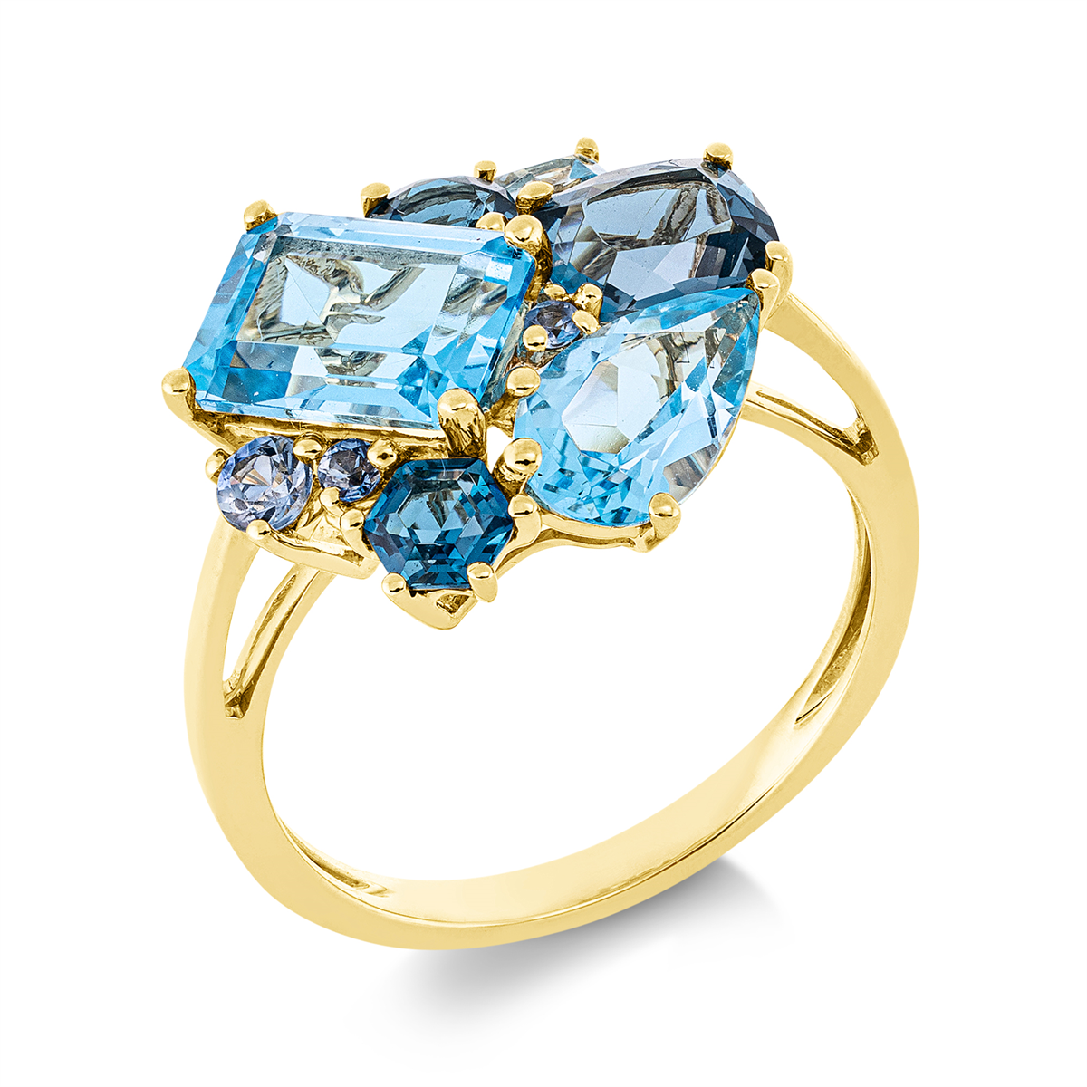 Ring 18 kt GG, 3 Topase 1,70 ct Lond. blue, 3 Topase 3,20 ct blau, 3 Saphire 0,19 ct blau, Weite:53