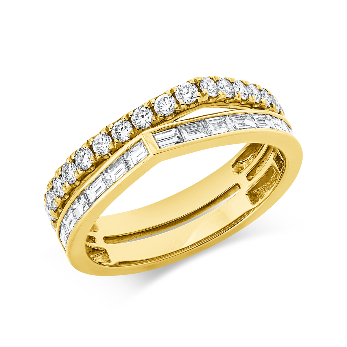 Ring 18 kt GG, 16 Baguette 0,56 ct, TW-si, 20 Brillanten 0,43 ct, TW-si, B:5,0 mm, Weite:53