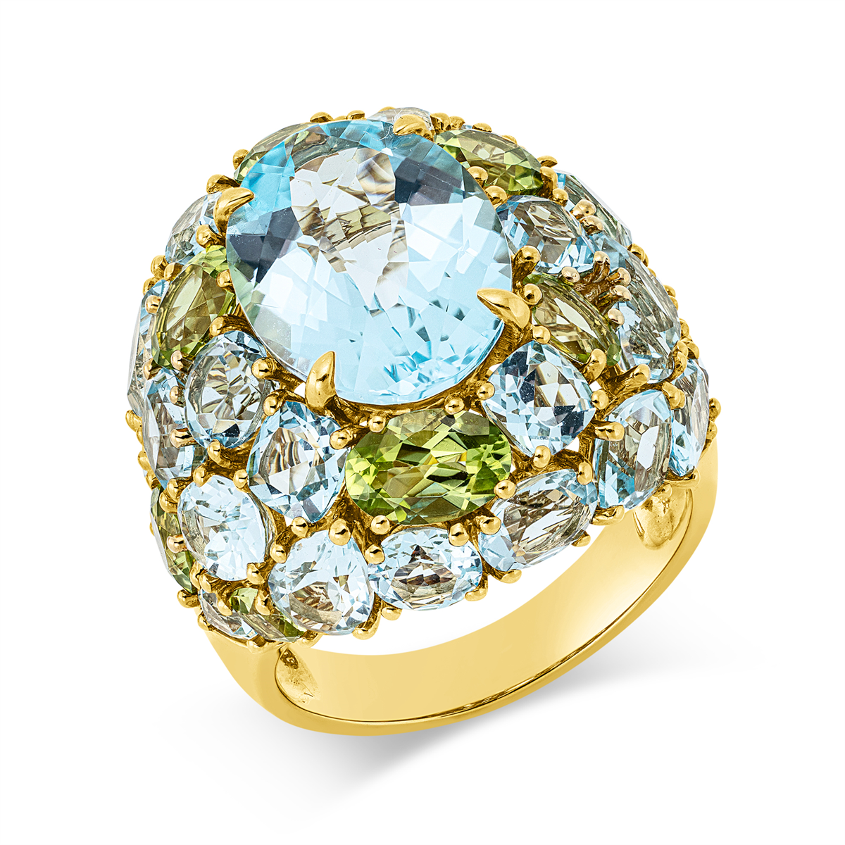 Ring 18 kt GG, 3 Brillanten 1,50 ct, TW-si, 5 Peridot 1,70 ct grün, 26 Topase 12,70 ct blau, 1 Topas 6,50 ct sky blue, B:22,1 mm, Weite:54