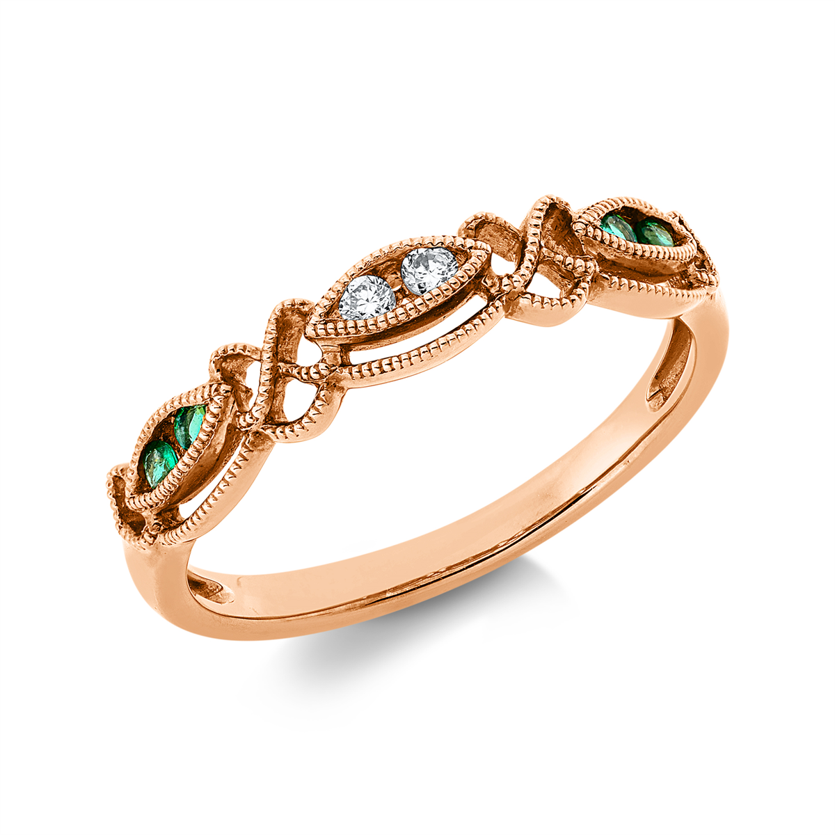 Ring 18 kt GG, 2 Brillanten 0,05 ct, TW-si, 4 Smaragde 0,07 ct grün, B:3,7 mm, Weite:52