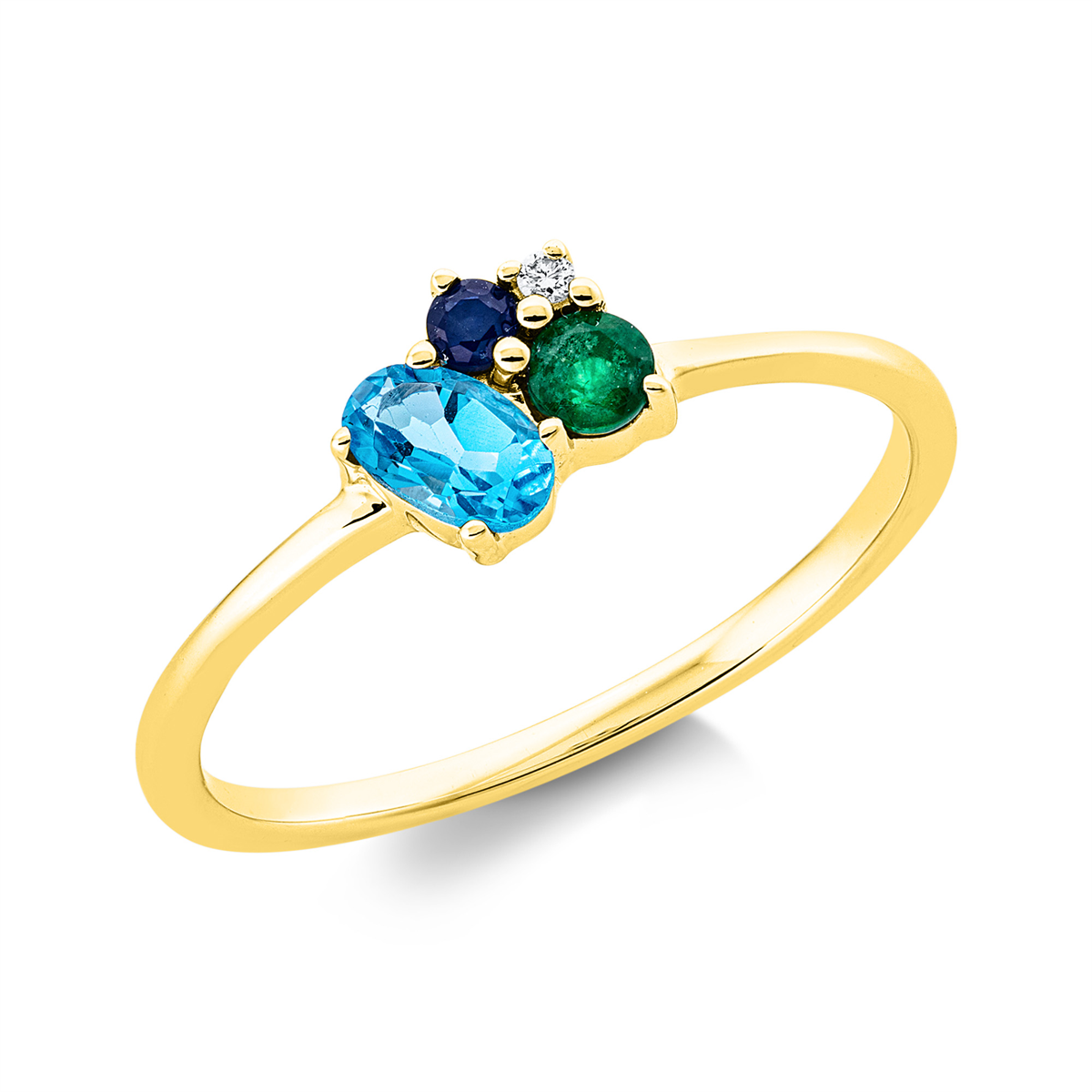 Ring 18 kt GG, 1 Brill. 0,01 ct, TW-si, 1 Smaragd 0,09 ct grün, 1 Saphir 0,05 ct blau, 1 Topas 0,31 ct blau, H:7,3 mm, B:6,3 mm, Weite:54