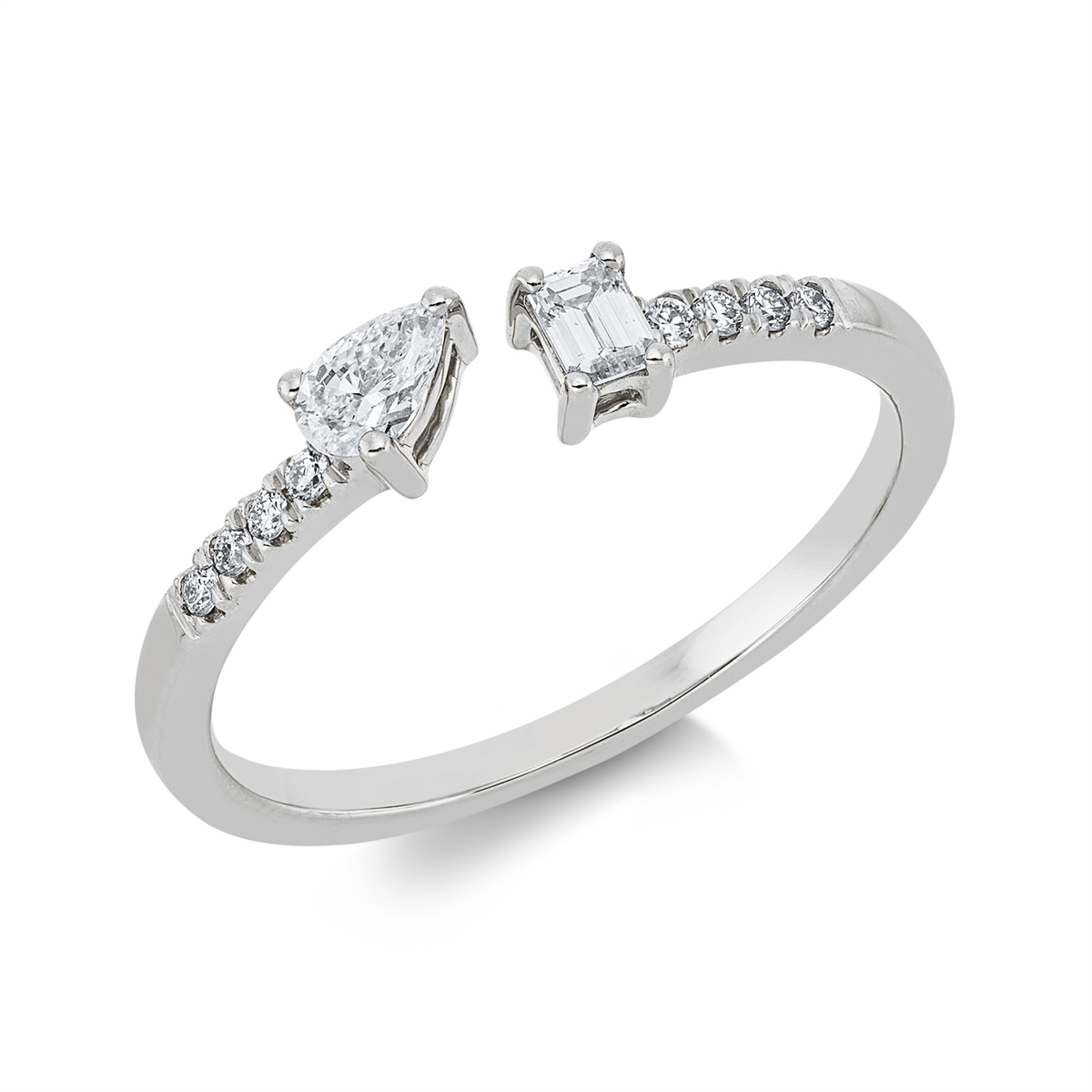 Ring 18 kt GG, 1 Tropfen 0,13 ct, TW-si, 1 Sm.schliff 0,09 ct, TW-si, 8 Brillanten 0,06 ct, TW-si, H:7,7 mm, B:3,8 mm, Weite:54