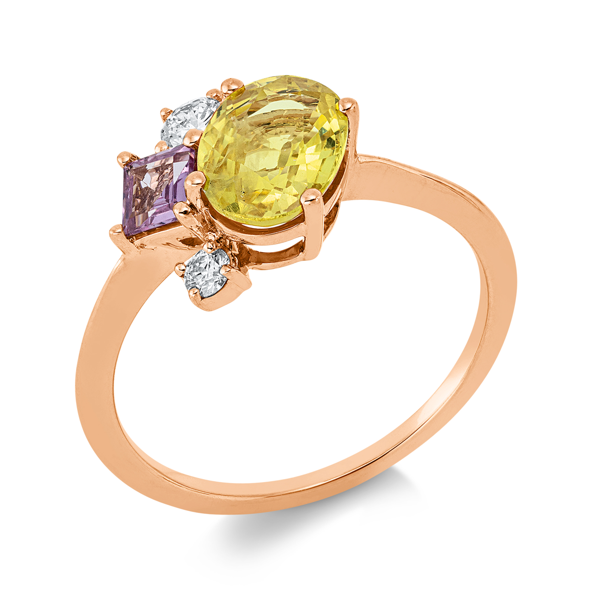 Ring 18 kt GG, 1 Brill. 0,12 ct, TW-si, 1 Brill. 0,06 ct, TW-si, 1 Saphir 1,52 ct gelb, 1 Saphir 0,38 ct pink, H:11,5 mm, B:9,3 mm, Weite:54