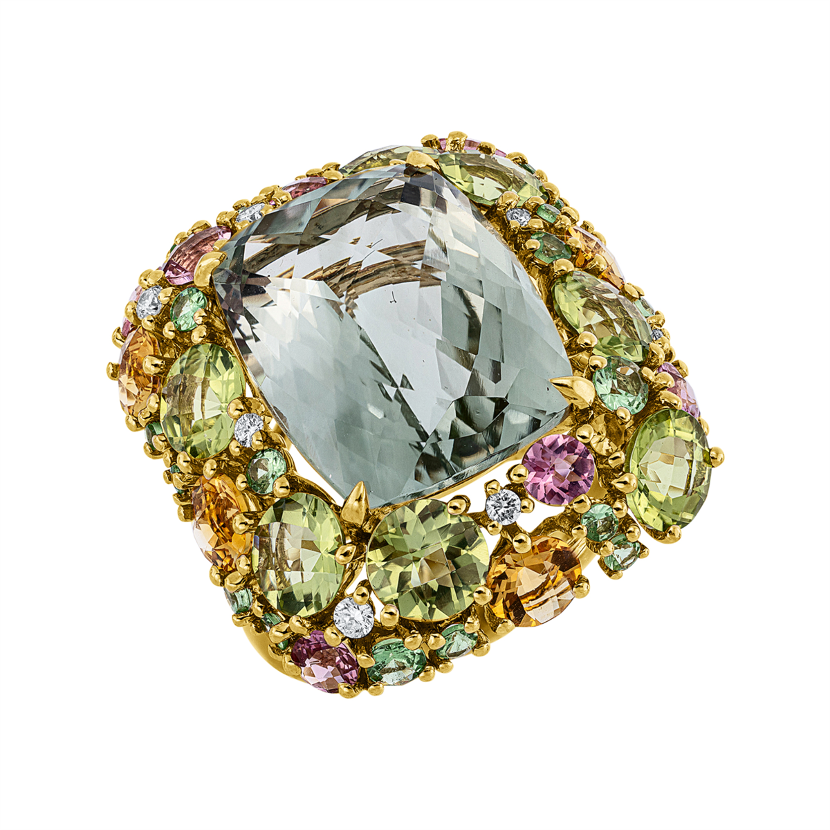 Ring 18 kt GG, 8 Brillanten 0,13 ct, TW-si, 1 Amethyst 10,70 ct grün, 42 Farbsteine 6,61 ct multicolor, Weite:53
