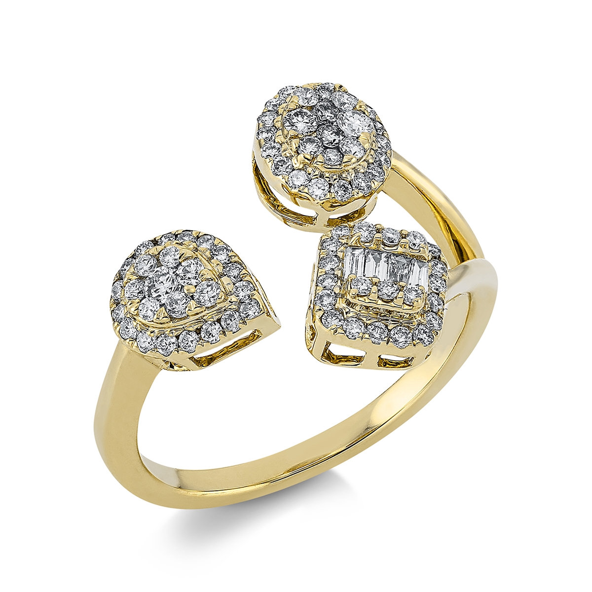 Ring 18 kt GG, 4 Baguette 0,08 ct, TW-si, 77 Brillanten 0,55 ct, TW-si, H:17,3 mm, B:16,3 mm, Weite:54