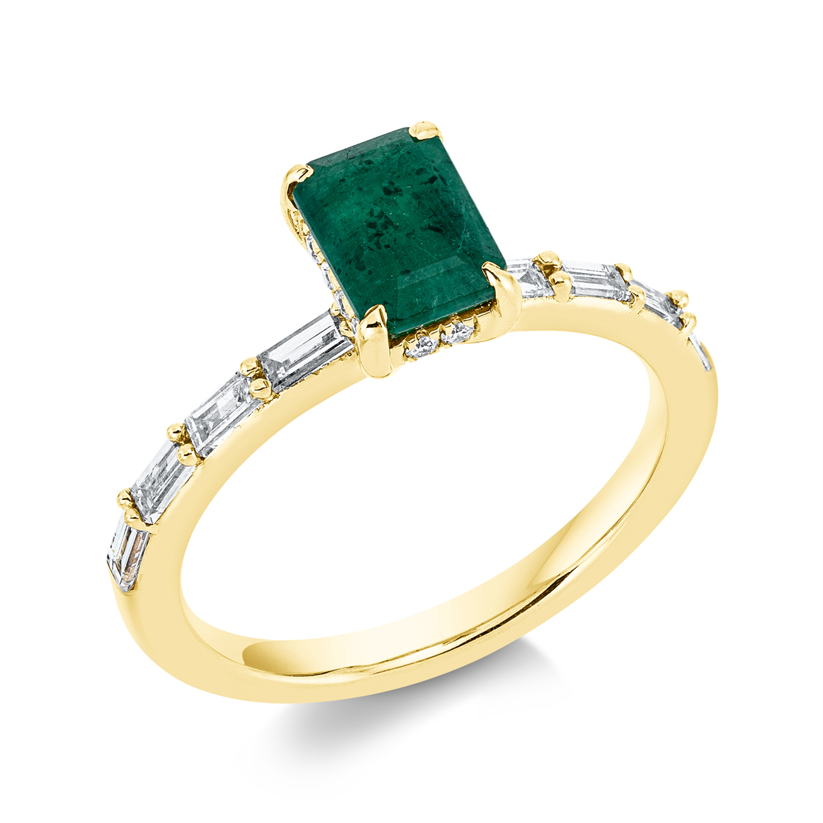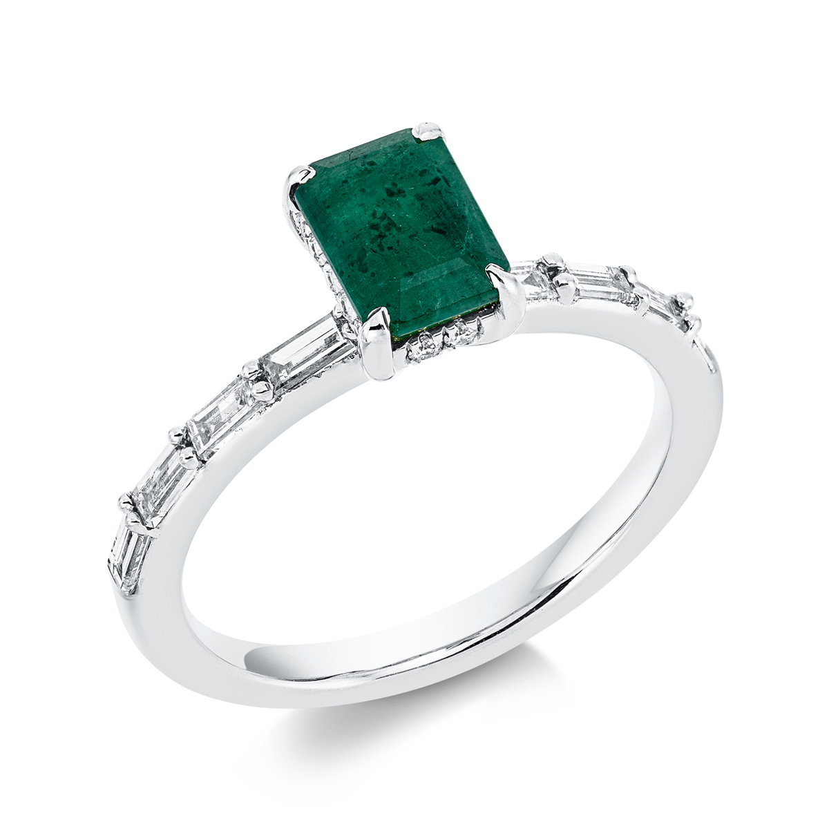 Ring 18 kt GG, 8 Baguette 0,33 ct, TW-si, 12 Brillanten 0,07 ct, TW-si, 1 Smaragd 1,10 ct grün, H:5,7 mm, B:7,6 mm, Weite:54