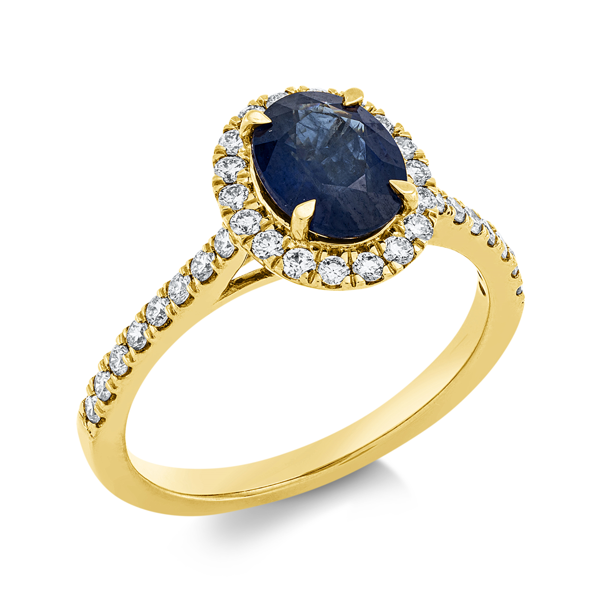 Ring 18 kt GG, 34 Brillanten 0,38 ct, TW-si, 1 Saphir 1,50 ct blau, Weite:54