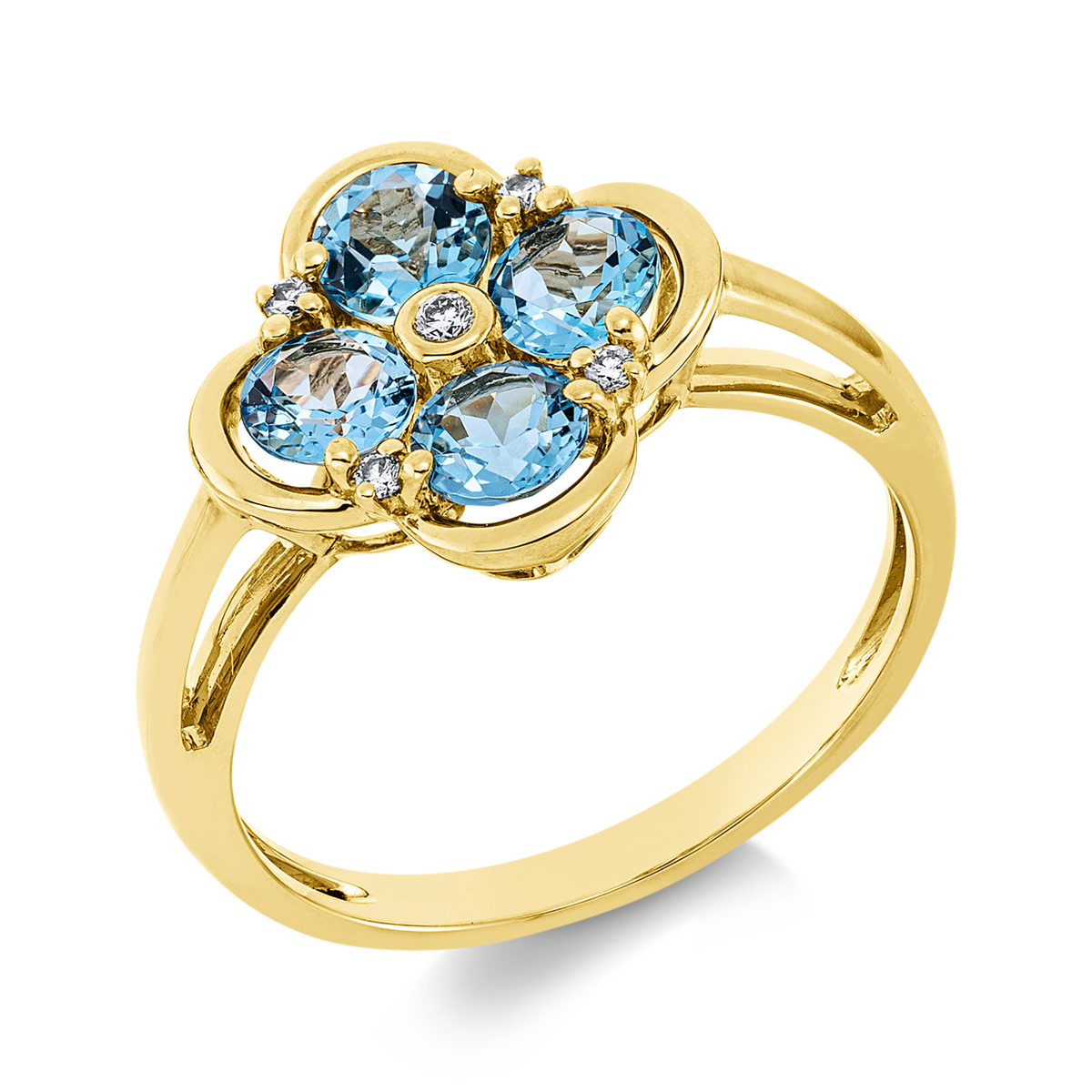 Ring 18 kt GG, 5 Brillanten 0,05 ct, TW-si, 4 Topase 1,30 ct blau, H:12,3 mm, B:12,8 mm, Weite:53