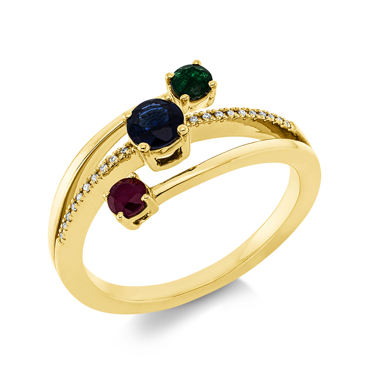Ring 18 kt GG, 20 Brillanten 0,03 ct, TW-si, 1 Rubin 0,17 ct rot, 1 Saphir 0,31 ct blau, 1 Smaragd 0,10 ct grün, Weite:54