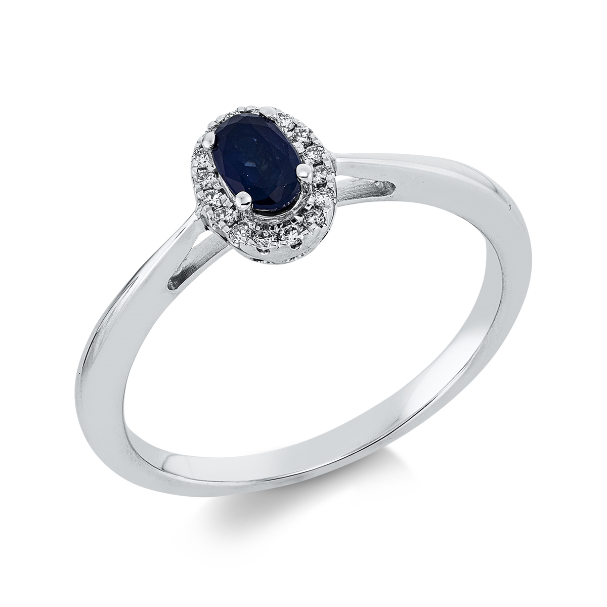 Ring 18 kt GG, 16 Brillanten 0,07 ct, TW-si, 1 Saphir 0,28 ct blau, H:5,8 mm, B:7,6 mm, Weite:54