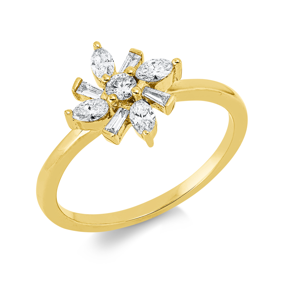Ring 18 kt GG, 4 Trapeze 0,08 ct, TW-vsi, 4 Navette 0,22 ct, TW-vsi, 1 Brill. 0,06 ct, TW-si, H:10,8 mm, B:10,6 mm, Weite:53