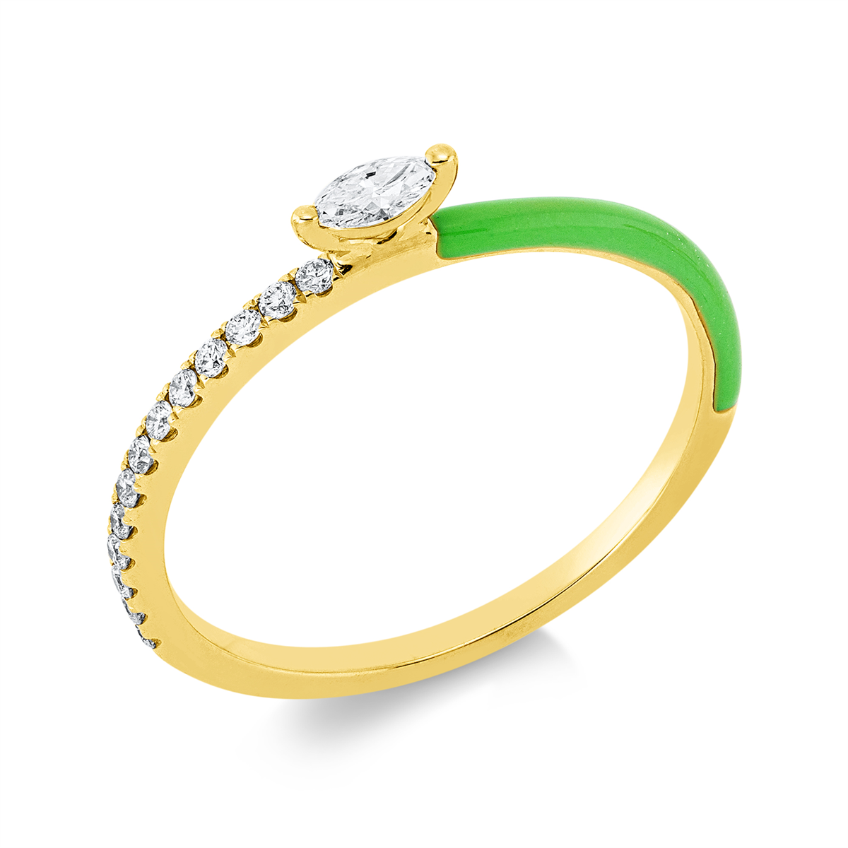 Ring 18 kt GG, 1 Navette 0,07 ct, TW-si, 13 Brillanten 0,09 ct, TW-si, 1 Emaille 0,05 ct grün, H:5,1 mm, B:2,1 mm, Weite:53