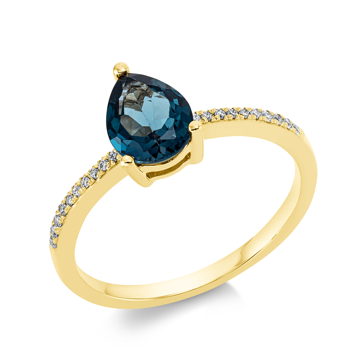 Ring 18 kt GG, 20 Brillanten 0,08 ct, TW-si, 1 Topas 1,23 ct Lond. blue, H:6,3 mm, B:8,9 mm, Weite:54