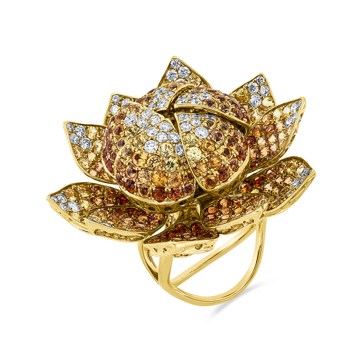 Ring 18 kt GG Blume/Blumen, 70 Brillanten 1,64 ct, TW-vsi/si, 13 Saphire 3,37 ct pink, 340 Saphire 15,04 ct gelb, Weite:54