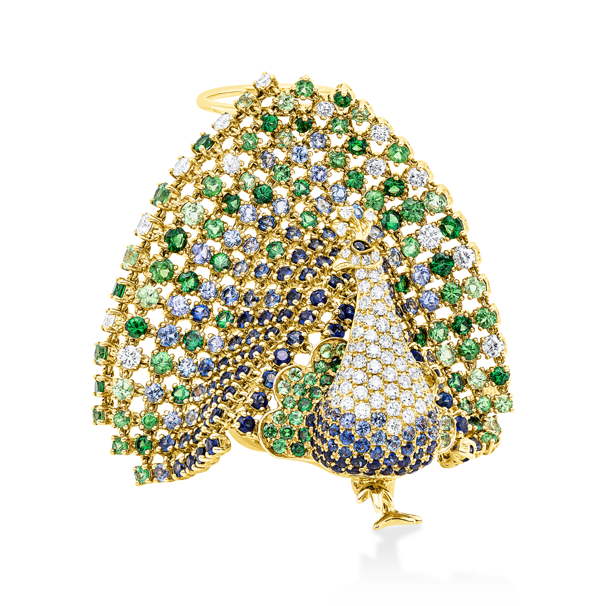 Ring 18 kt GG Pfauen, 86 Brillanten 1,92 ct, TW-vsi/si, 1 Brill. 0,01 ct, schwarz, 321 Farbsteine 4,82 ct fancy, Weite:56,5