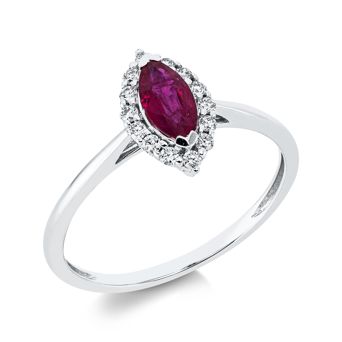 Ring 18 kt RG, 14 Brillanten 0,14 ct, W-vsi, 1 Rubin 0,38 ct rot, Weite:53