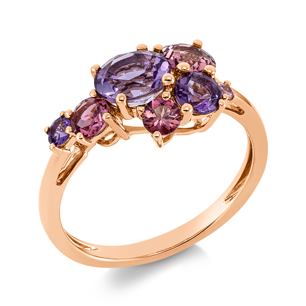 Ring 18 kt RG, 2 Amethyste 1,10 ct pink, 1 Amethyst 1,00 ct lila, 3 Turmalin 0,80 ct pink, 1 Saphir 0,03 ct pink, Weite:53