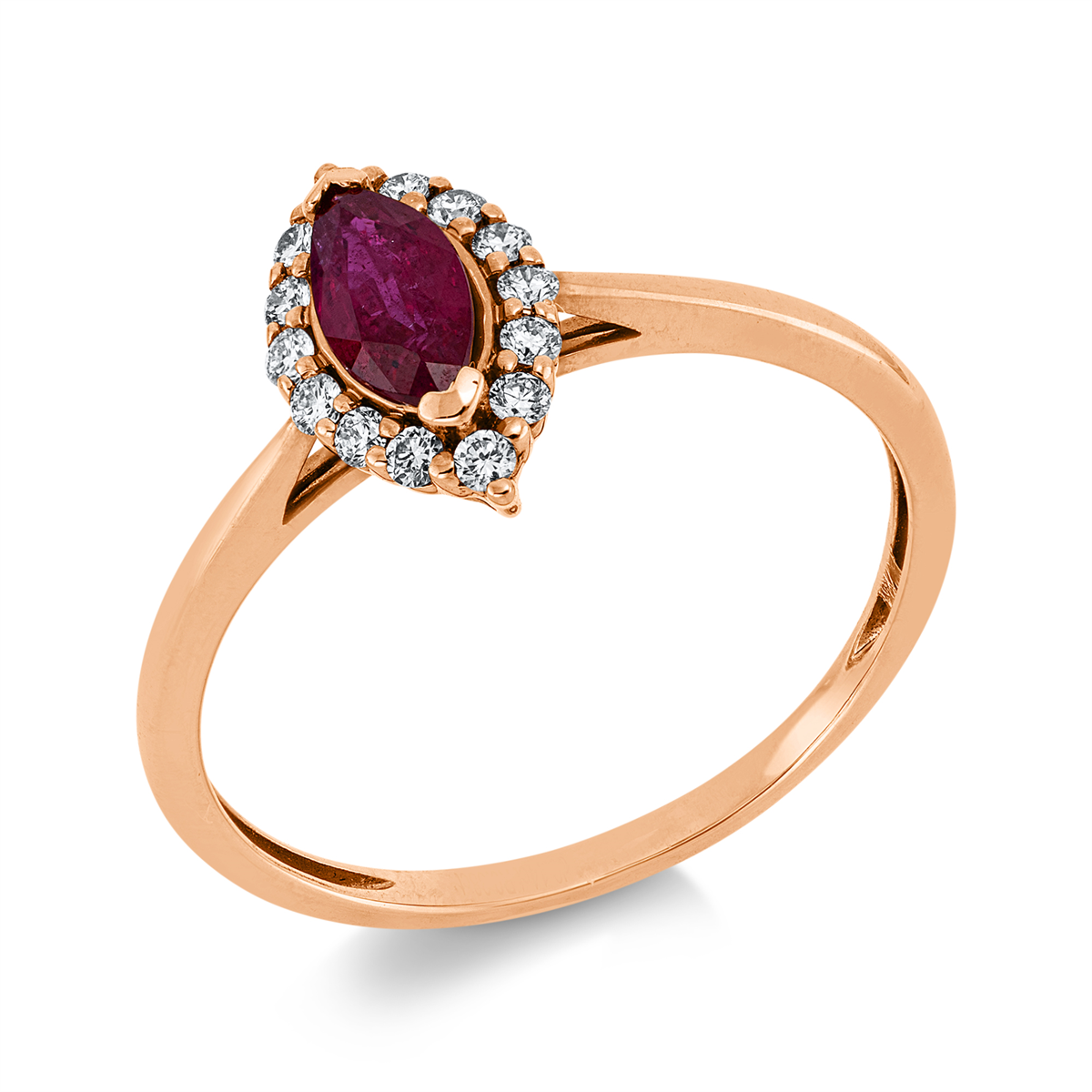 Ring 18 kt RG, 14 Brillanten 0,14 ct, TW-si, 1 Rubin 0,38 ct rot, Weite:53