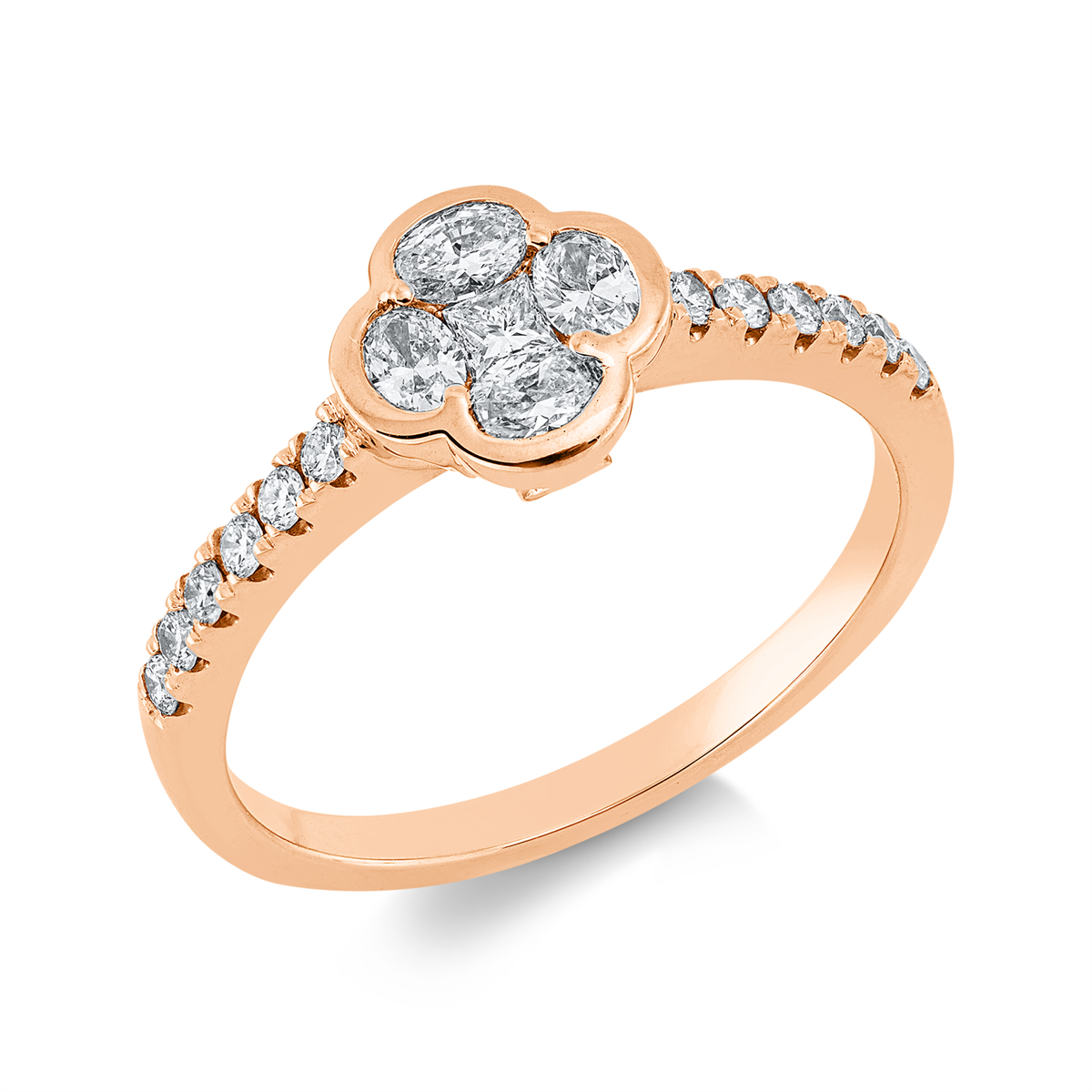 Ring 18 kt RG, 1 Princ. 0,06 ct, TW-vsi, 4 Oval 0,31 ct, TW-vsi, 12 Brillanten 0,16 ct, TW-si, H:8,2 mm, B:7,7 mm, Weite:53