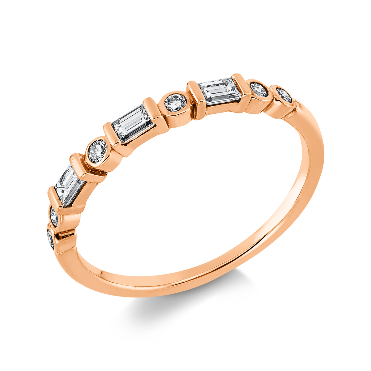 Ring 18 kt RG, 3 Baguette 0,23 ct, TW-si, 6 Brillanten 0,10 ct, TW-si, B:2,1 mm, Weite:54