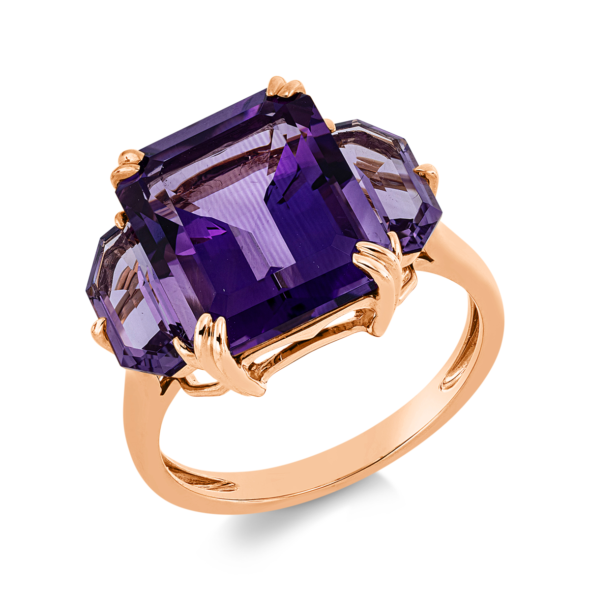 Ring 18 kt RG, 1 Amethyst 6,00 ct lila, 2 Amethyste 1,50 ct lila, Weite:53