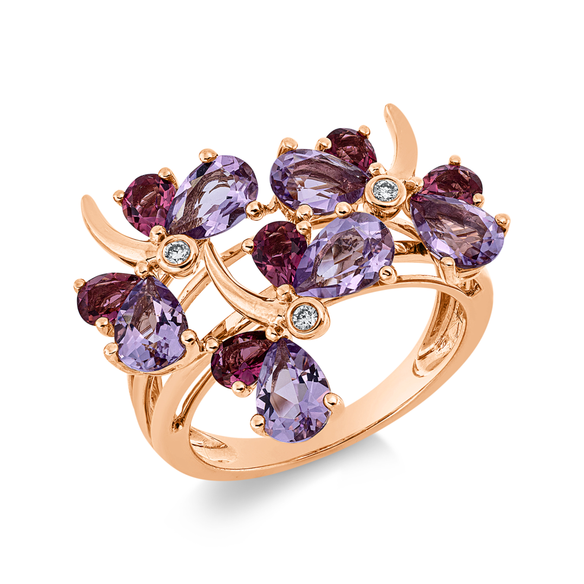 Ring 18 kt RG, 3 Brillanten 0,04 ct, TW-si, 6 Amethyste 2,10 ct pink, 6 Turmalin 1,00 ct pink, H:23,0 mm, B:18,9 mm, Weite:53