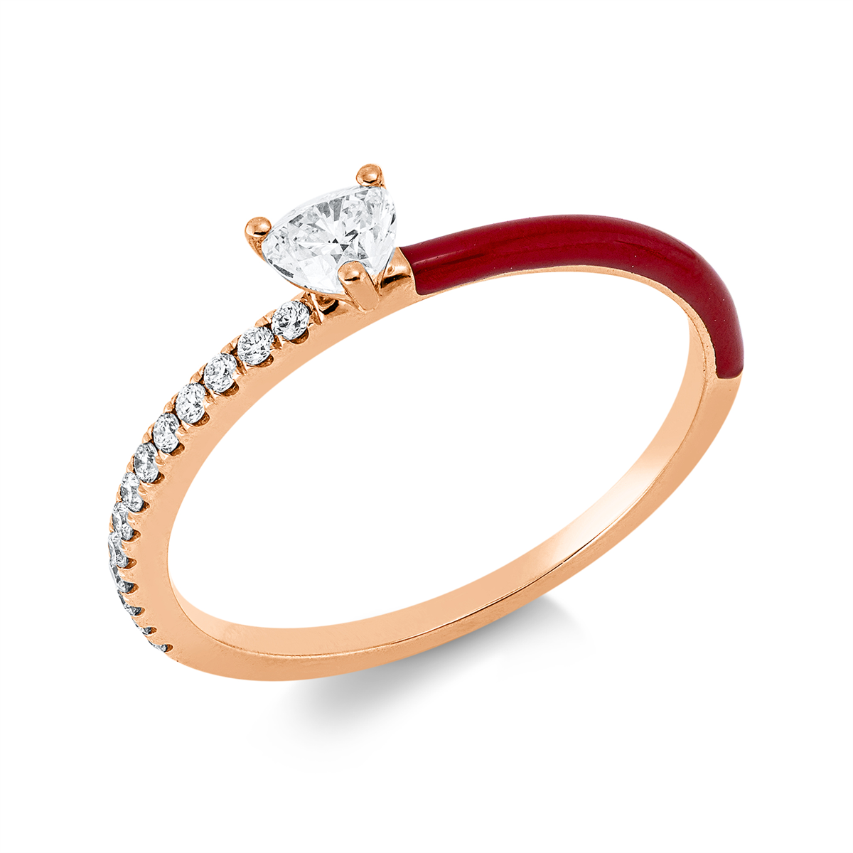Ring 18 kt RG, 1 Herzschl. 0,19 ct, TW-si, 13 Brillanten 0,09 ct, TW-si, 1 Emaille 0,05 ct rot, H:4,2 mm, B:4,0 mm, Weite:53