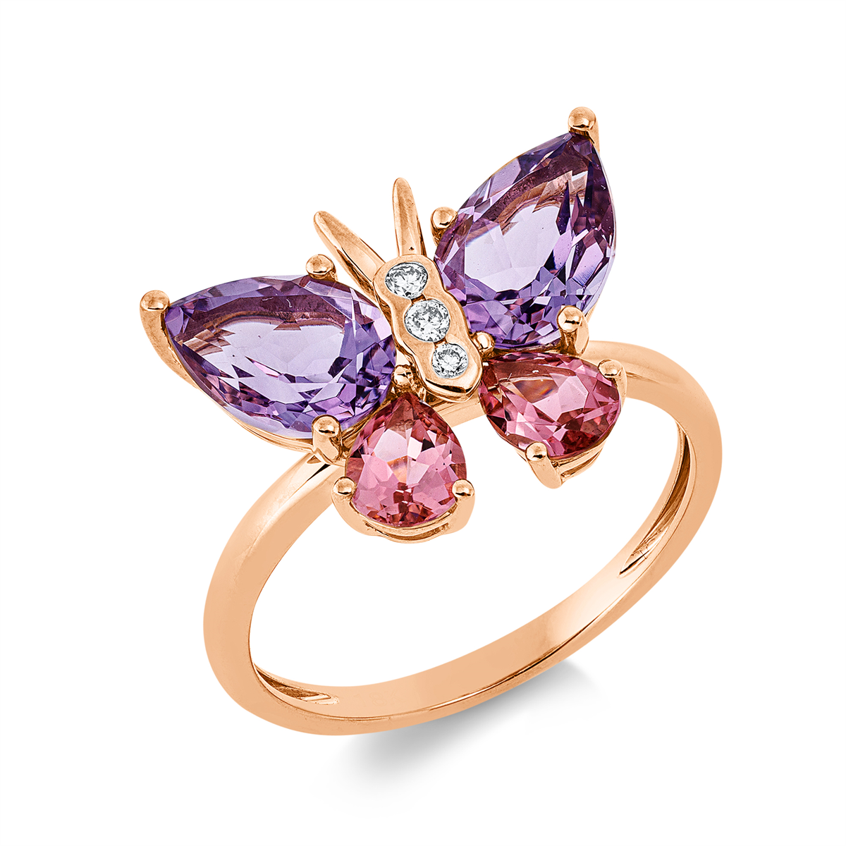 Ring 18 kt RG, 3 Brillanten 0,05 ct, TW-si, 2 Amethyste 2,10 ct pink, 2 Turmalin 0,80 ct pink, H:16,5 mm, B:12,0 mm, Weite:53