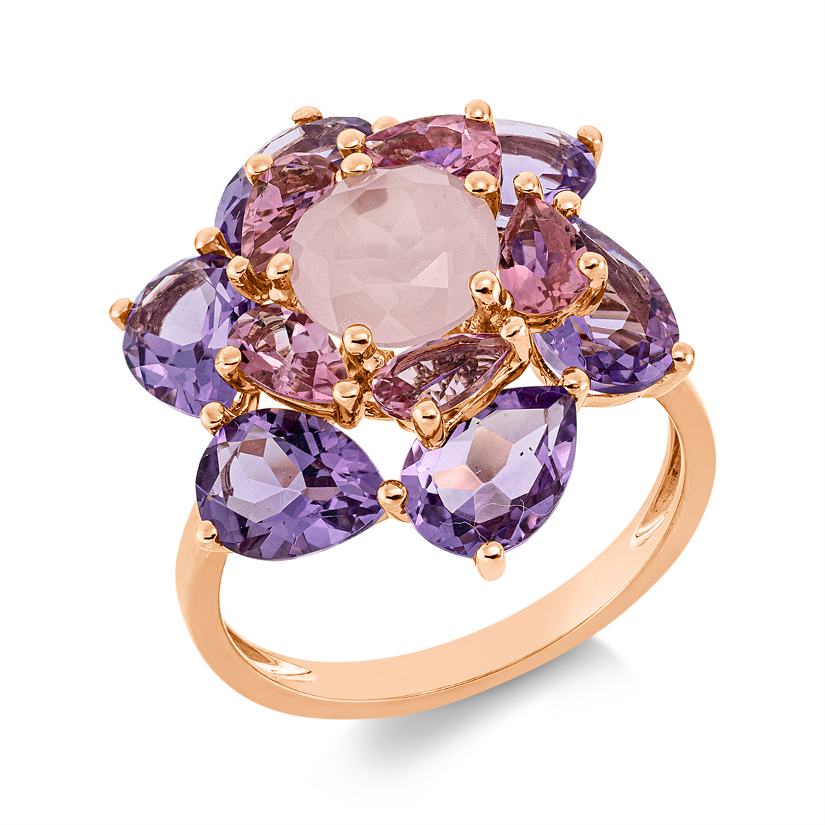 Ring 18 kt RG, 5 Turmalin 1,00 ct pink, 1 Rosenquarz 1,30 ct rosé, 6 Amethyste 3,80 ct pink, Weite:53