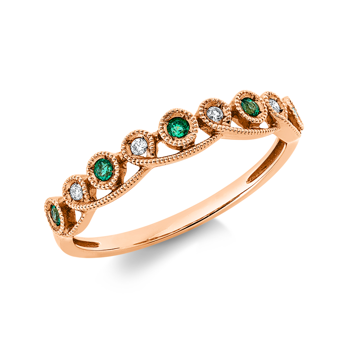 Ring 18 kt RG, 4 Brillanten 0,03 ct, TW-si, 5 Smaragde 0,08 ct grün, B:3,3 mm, Weite:52