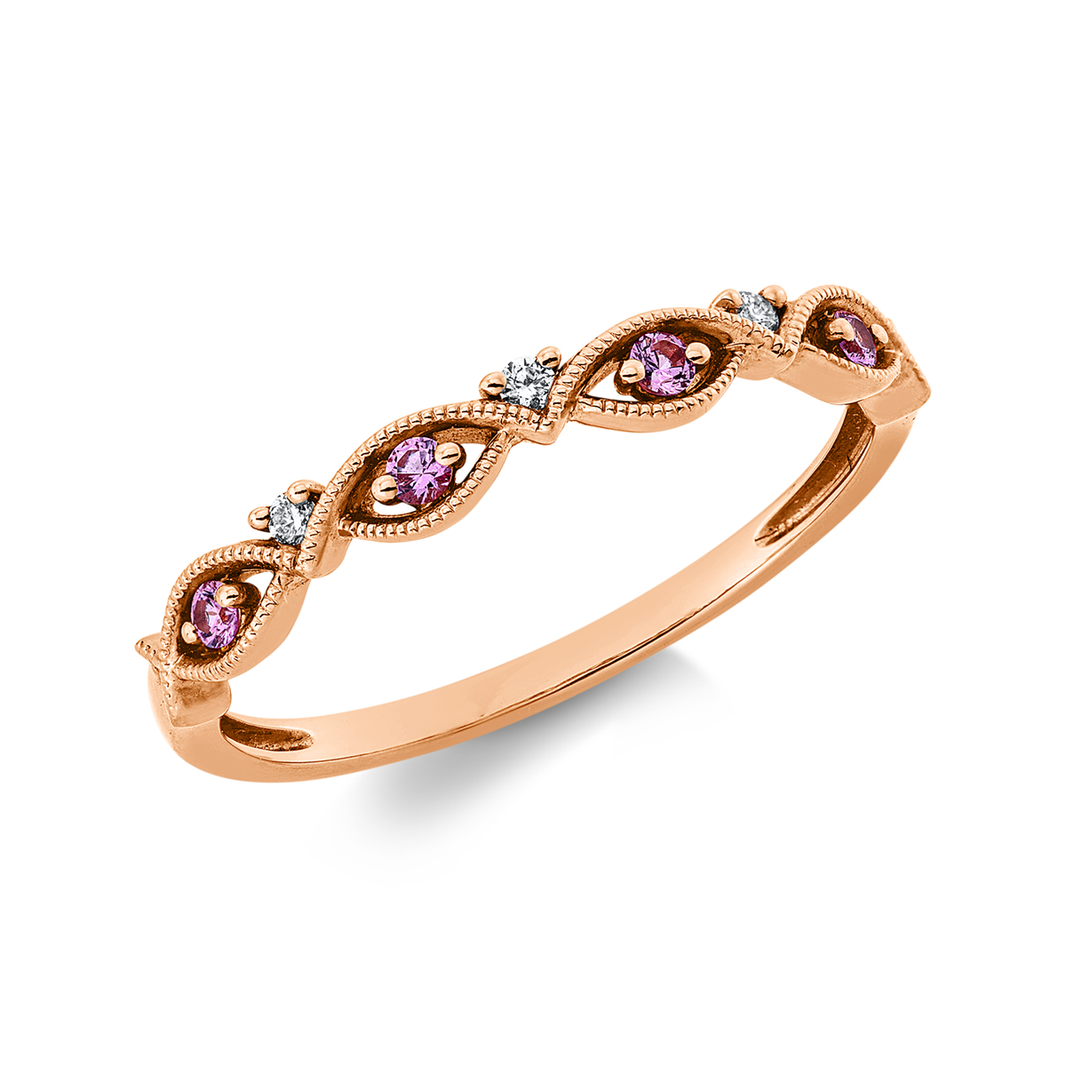 Ring 18 kt RG, 3 Brillanten 0,03 ct, TW-si, 4 Saphire 0,07 ct pink, B:2,5 mm, Weite:52