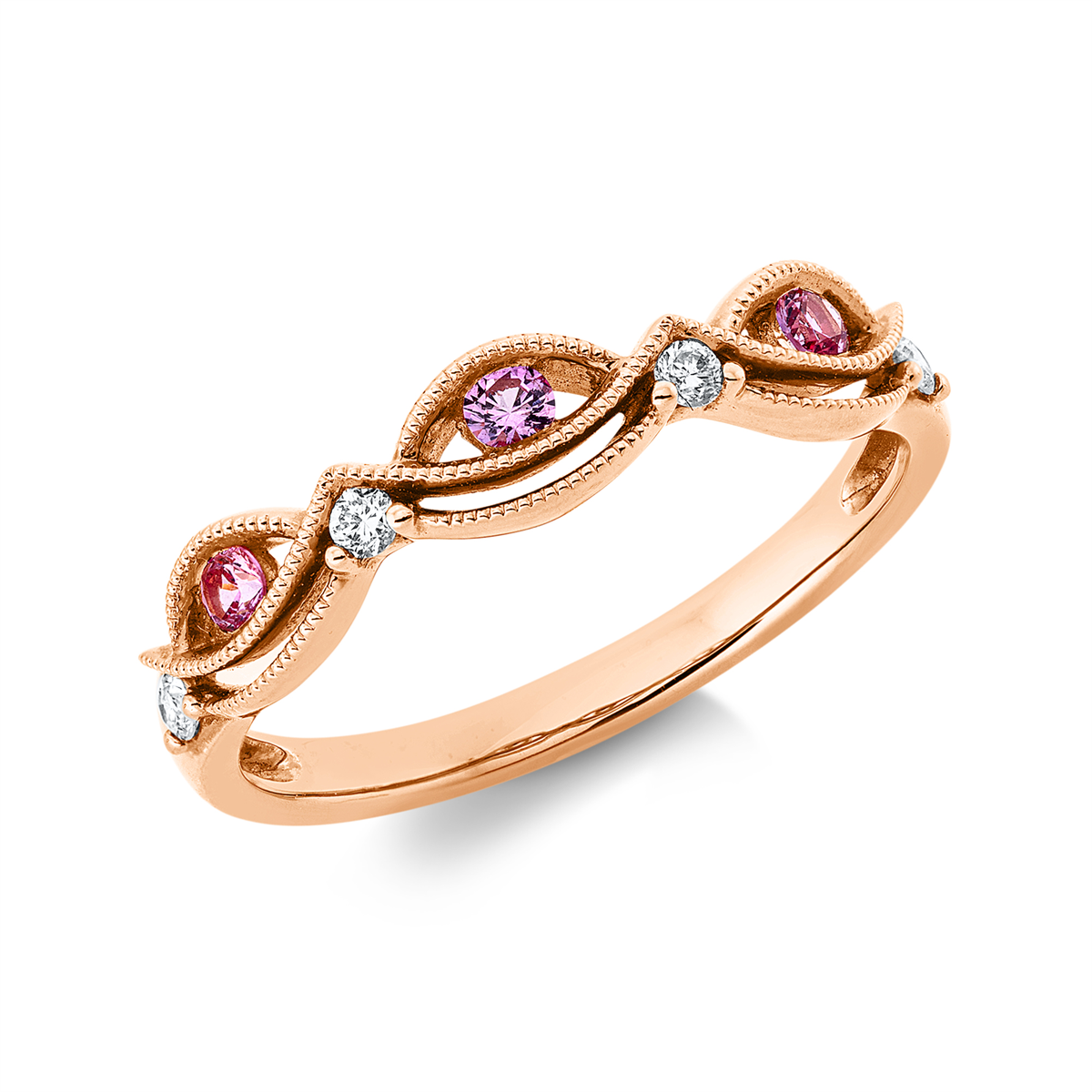 Ring 18 kt RG, 4 Brillanten 0,07 ct, TW-si, 3 Saphire 0,12 ct pink, B:4,0 mm, Weite:52