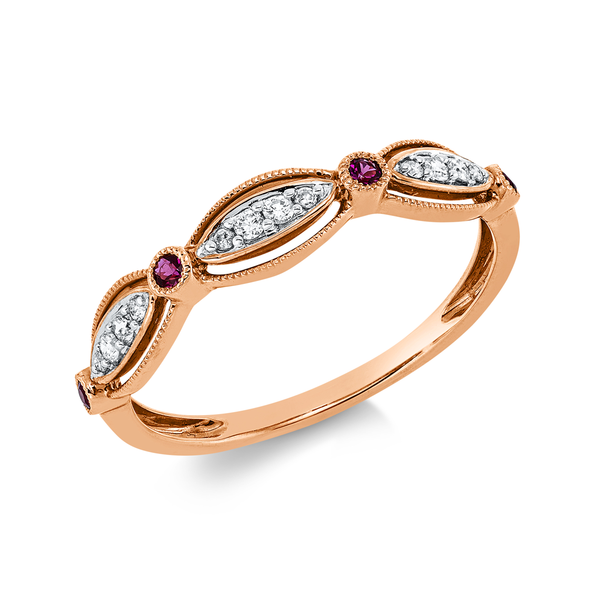 Ring 18 kt RG, Fassung rhodiniert, 12 Brillanten 0,07 ct, TW/W-si, 4 Rubine 0,06 ct rot, Weite:52