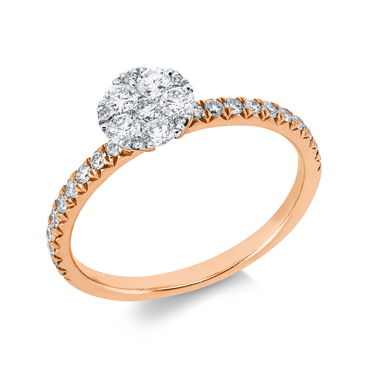 Ring 18 kt RG, Fassung rhodiniert, 22 Brillanten 0,25 ct, TW-si, 6 Brillanten 0,30 ct, TW-si, 5 Brillanten 0,02 ct, TW-si, Weite:53