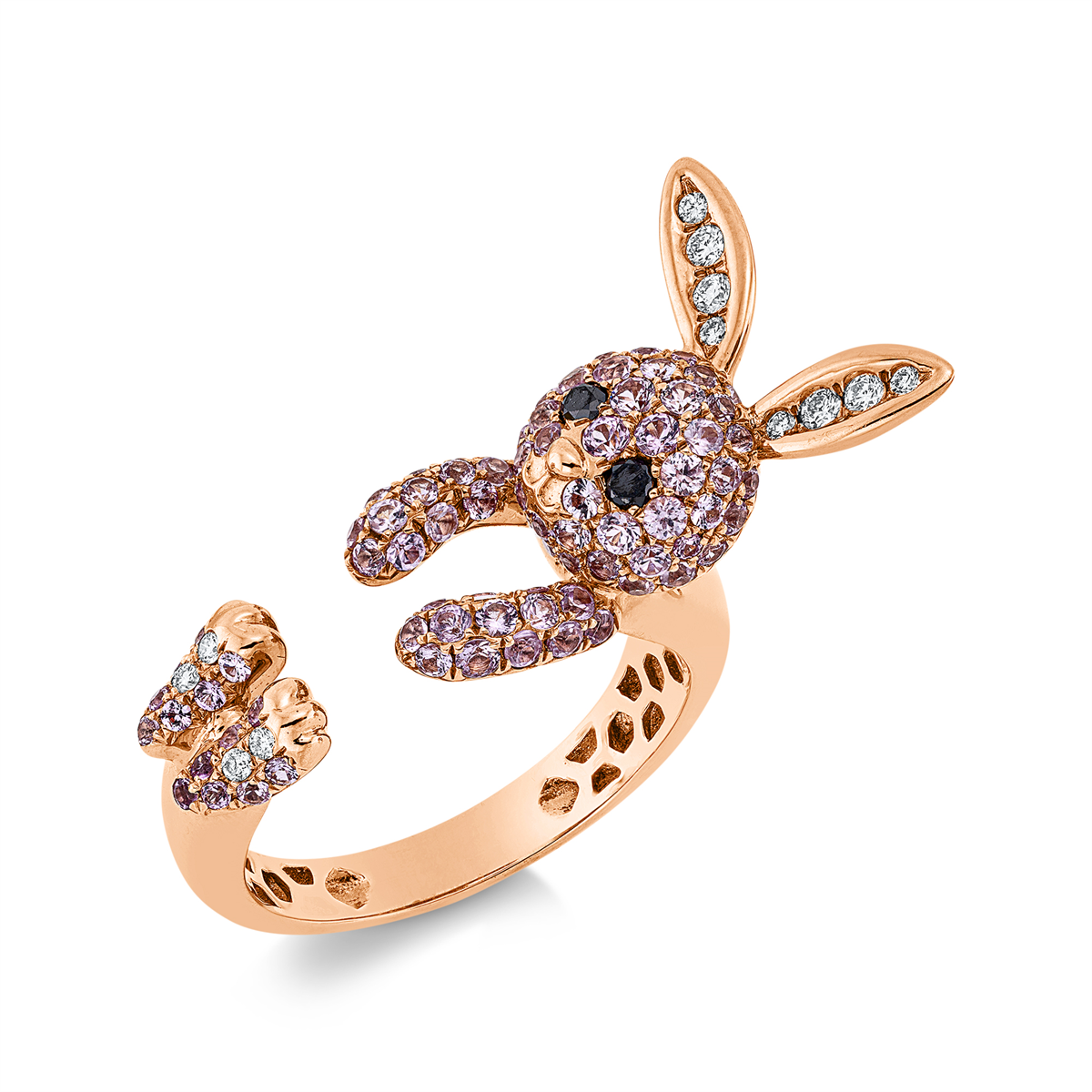 Ring 18 kt RG Kaninchen, 12 Brillanten 0,10 ct, TW-vsi, 2 Brillanten 0,05 ct, schwarz, 87 Saphire 1,11 ct pink, Weite:53