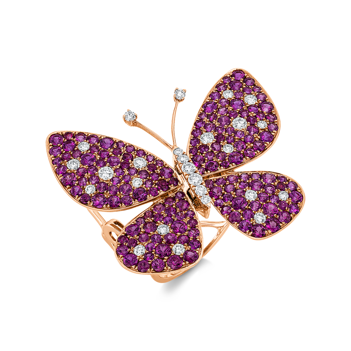 Ring 18 kt RG Schmetterling, 26 Brillanten 0,72 ct, TW-vsi/si, 164 Rubine 5,68 ct rot, Weite:54