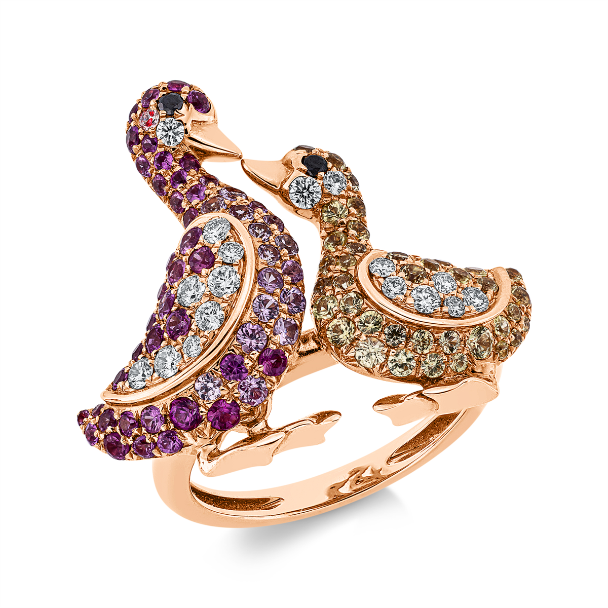 Ring 18 kt RG Vogel, 18 Brillanten 0,28 ct, TW-vsi, 2 Brillanten 0,03 ct, schwarz, 40 Saphire 0,60 ct gelb, 56 Saphire 0,98 ct pink, Weite:53