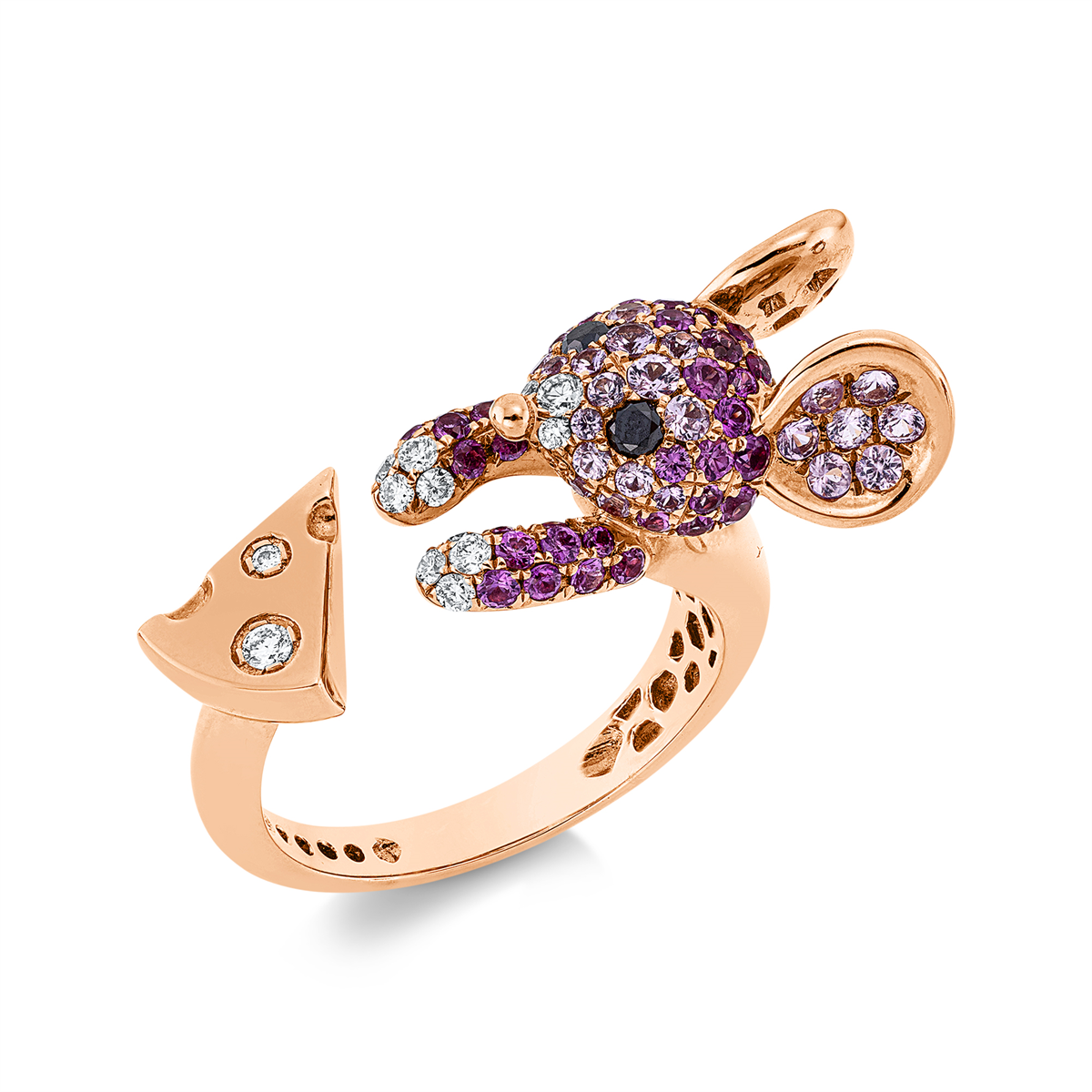 Ring 18 kt RG+GG, 13 Brillanten 0,14 ct, TW-vsi, 2 Brillanten 0,07 ct, schwarz, 76 Saphire 1,16 ct pink, Weite:53