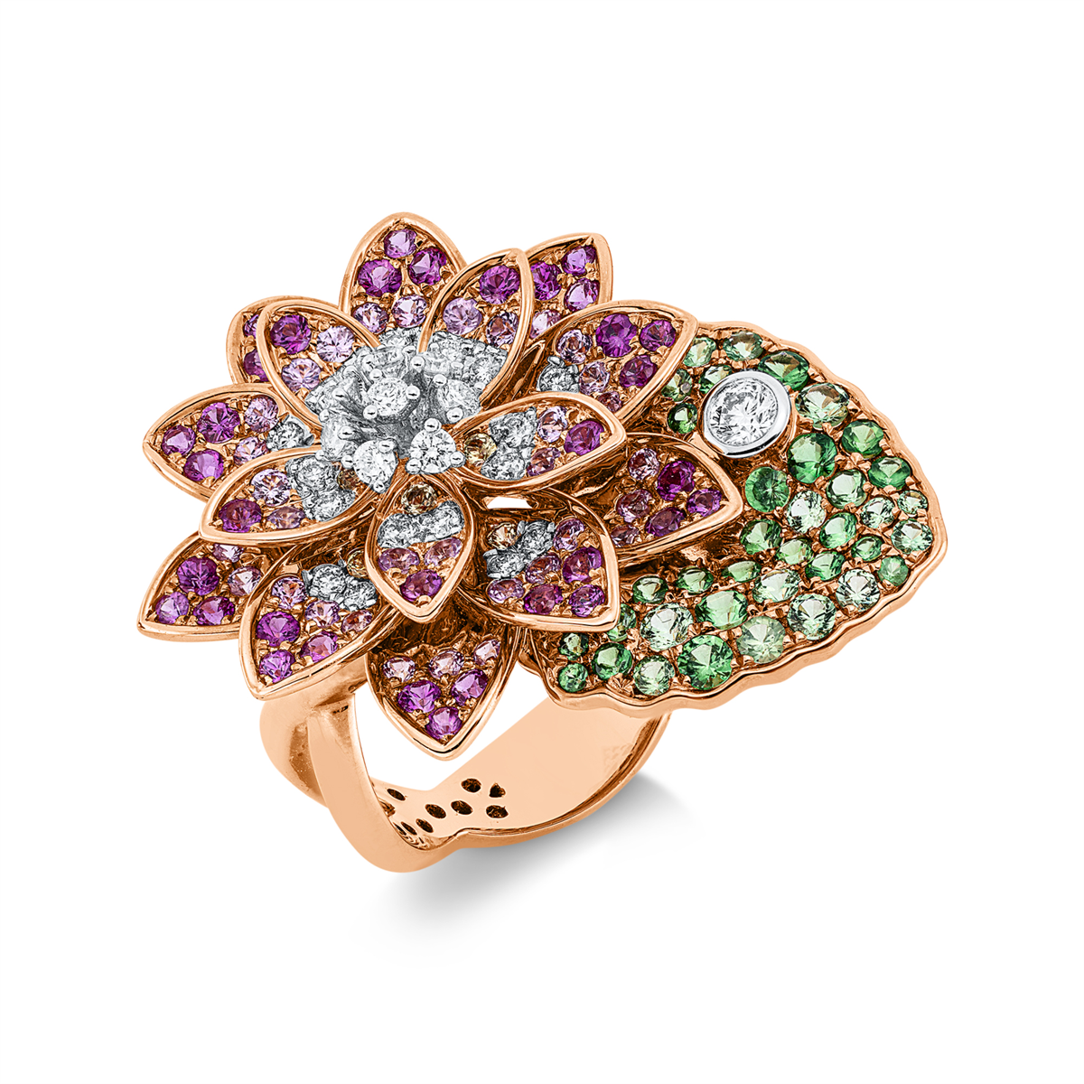 Ring 18 kt RG+WG Blume/Blumen, 29 Brillanten 0,44 ct, TW-vsi, 75 Saphire 1,43 ct pink, 10 Saphire 0,15 ct gelb, 39 Tsavorith 0,90 ct grün, Weite:53